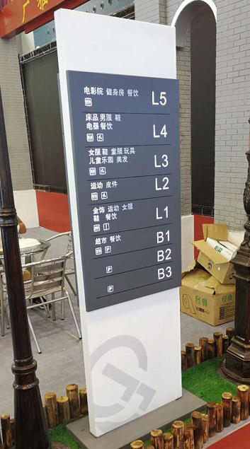 三級導視:從二級導視近一步的延伸,進入到商場內部。指示功能區域或者工作區域的。例如:大堂的索引牌、各百貨區或者功能區的指示、電梯間的辦公樓層指示牌、懸掛區域指標牌等。